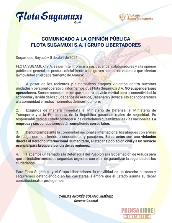 1. A pesar de los recientes y sistemáticos ataques violentos contra nuestras unidades y personal operativo, informamos que Flota Sugamuxi S.A. NO suspenderá sus operaciones. Somos conscientes de que nuestro servicio es vital para la conectividad, la economía y la vida de los ciudadanos de Arauca, Casanare y Boyacá. No abandonaremos a la comunidad en estos momentos de incertidumbre.