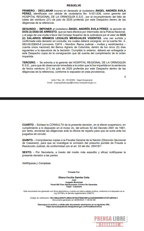 El Juzgado Segundo Penal para Adolescentes con función de Control de Garantías de Yopal declaró incurso en desacato a un fallo de tutela, al Gerente del Hospital Regional de la Orinoquía E.S.E Ángel Andrés Ávila Pérez, tutelando el derecho fundamental de petición de un ex funcionario del centro asistencial que solicitaba información documental de todos los contratos y certificaciones de su paso por la entidad y reconocimiento de derechos laborales.