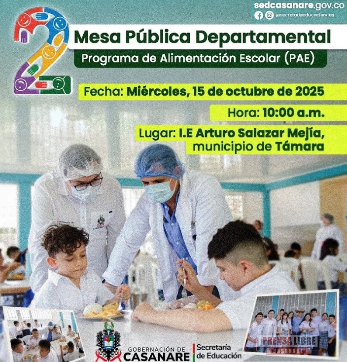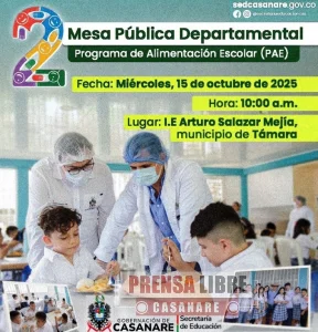La Institución Educativa Arturo Salazar Mejía, en el municipio de Támara, será el escenario de la Segunda Mesa Pública Departamental del Programa de Alimentación Escolar (PAE), programada para este miércoles 15 de octubre de 2025 a las 10:00 a.m.