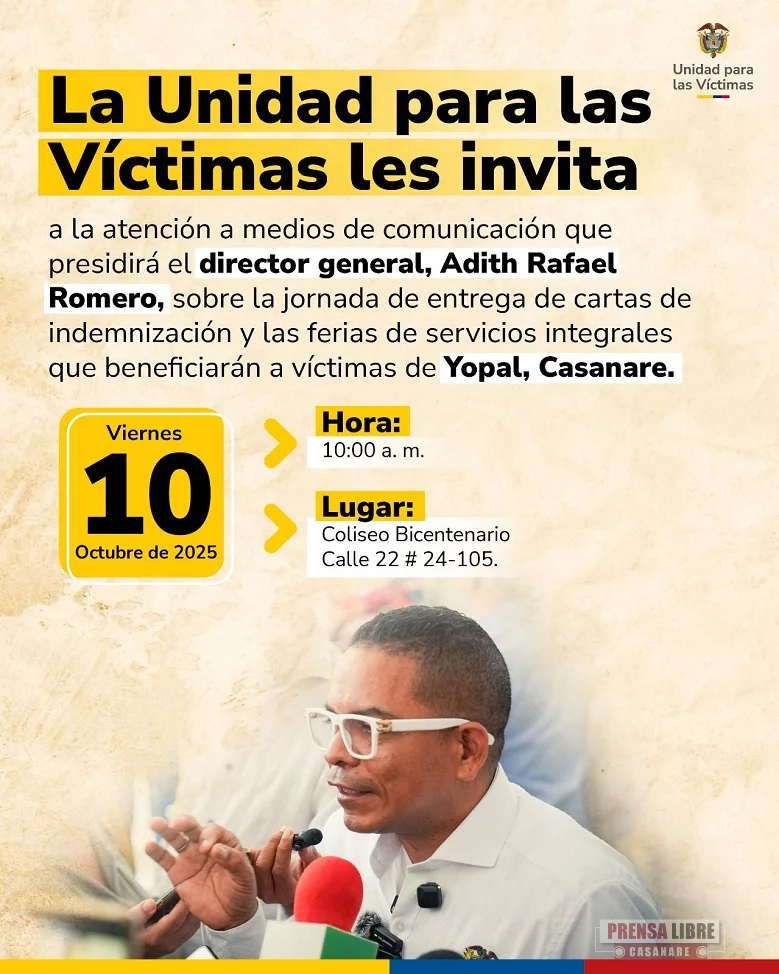 El director general de la Unidad para las Víctimas, Adith Rafael Romero Polanco, estará este viernes 10 de octubre en Yopal en la entrega de cartas de indemnización, que beneficiarán a víctimas del conflicto armado del departamento de Casanare.