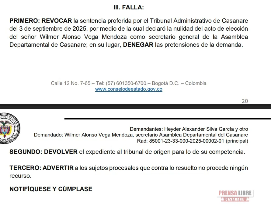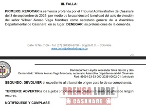 Mediante sentencia del 13 de noviembre de 2025, el Consejo de Estado, revocó la decisión de primera instancia y ratificó la validez de la elección del Secretario General de la Asamblea Departamental de Casanare, Wilmer Alonso Vega Mendoza, realizada el 28 de noviembre de 2024.