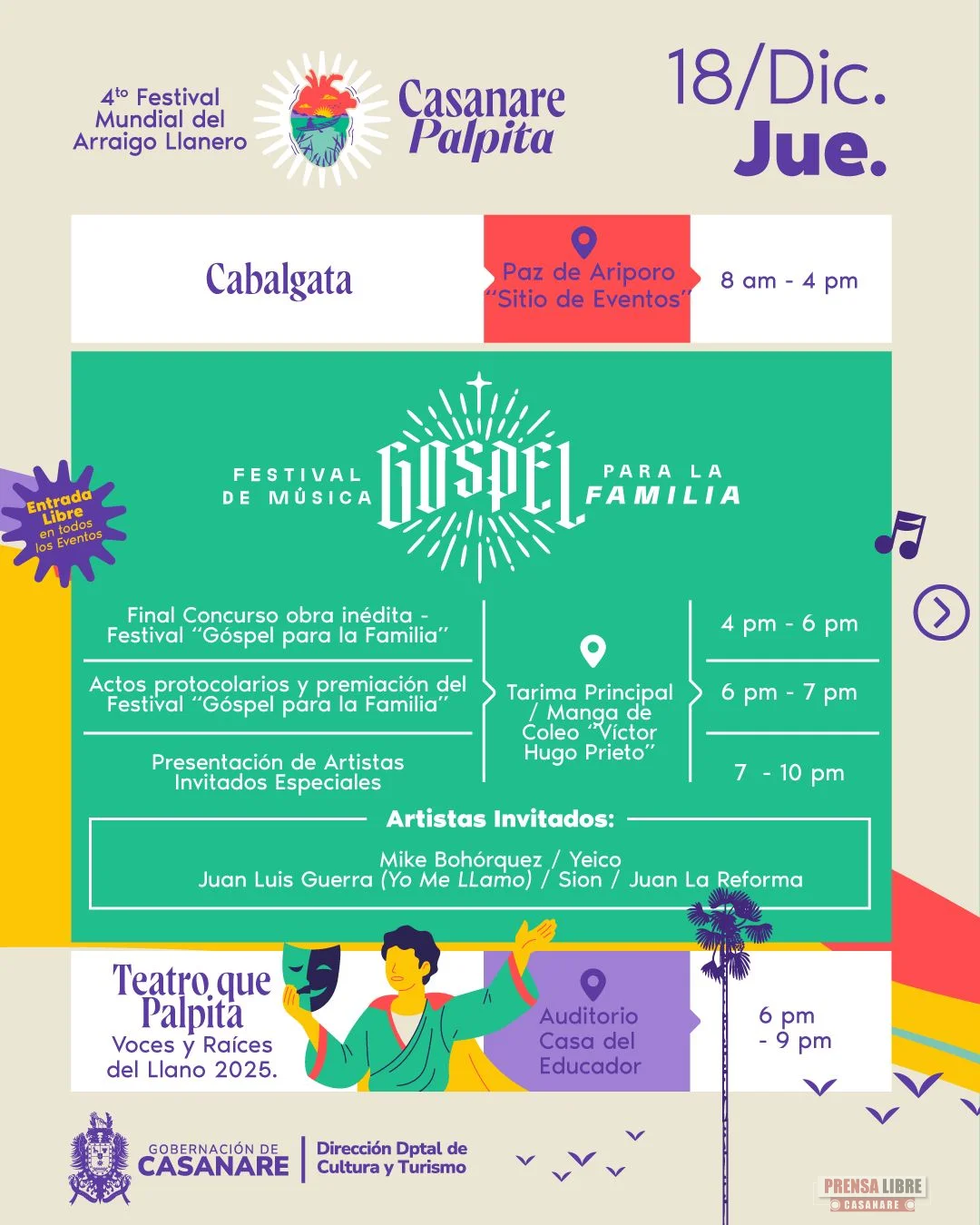 La agenda inicia este jueves 18 de diciembre con la Cabalgata 2025, espacios de teatro, la final del Festival de Música Góspel y presentaciones artísticas especiales en la Manga de Coleo Víctor Hugo Prieto.