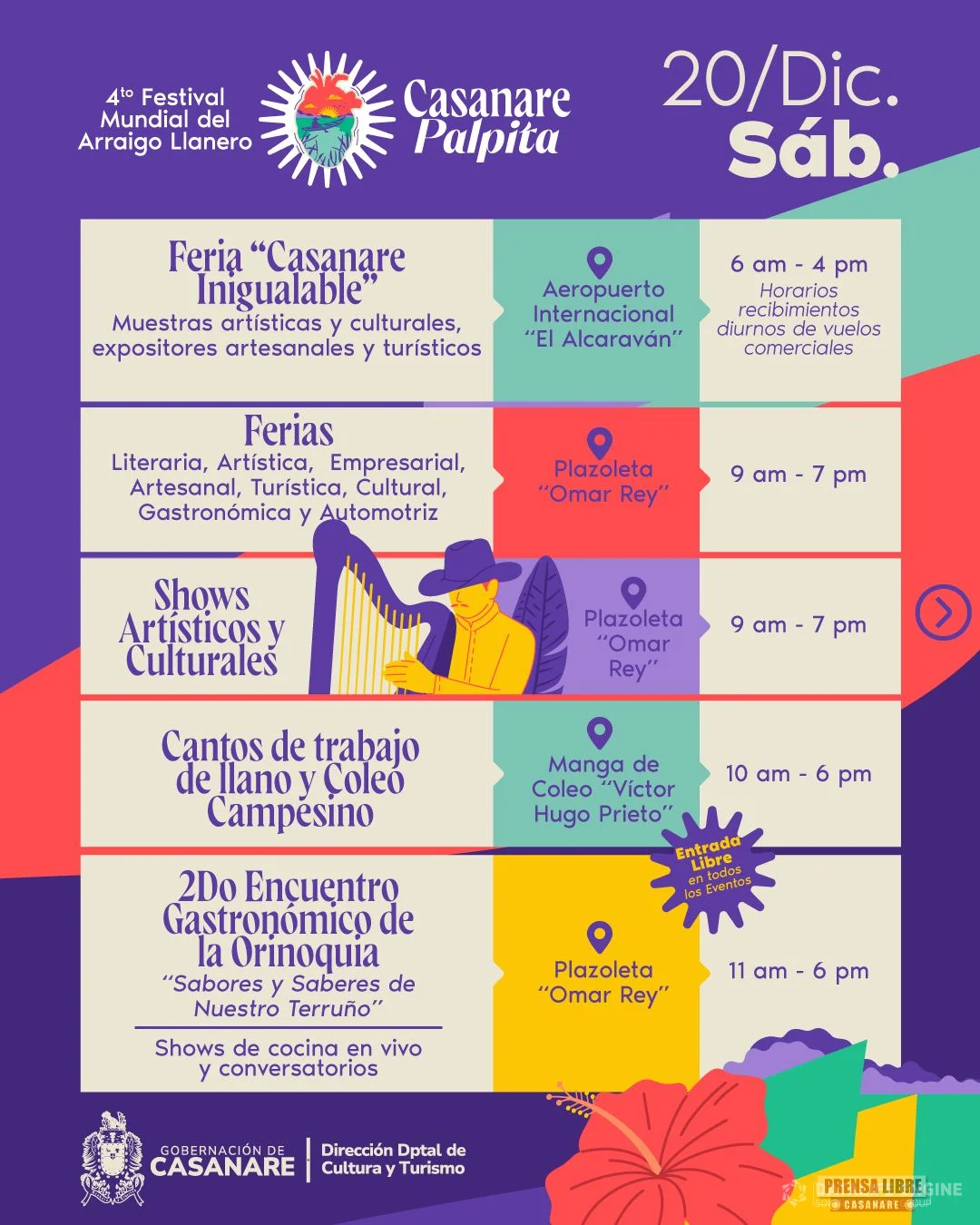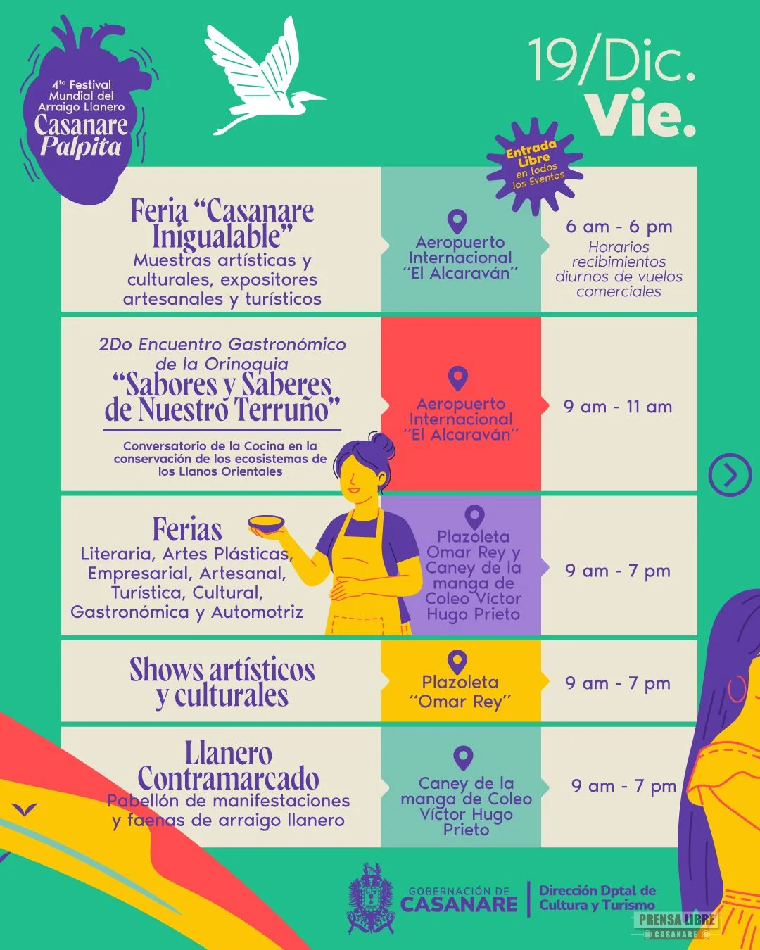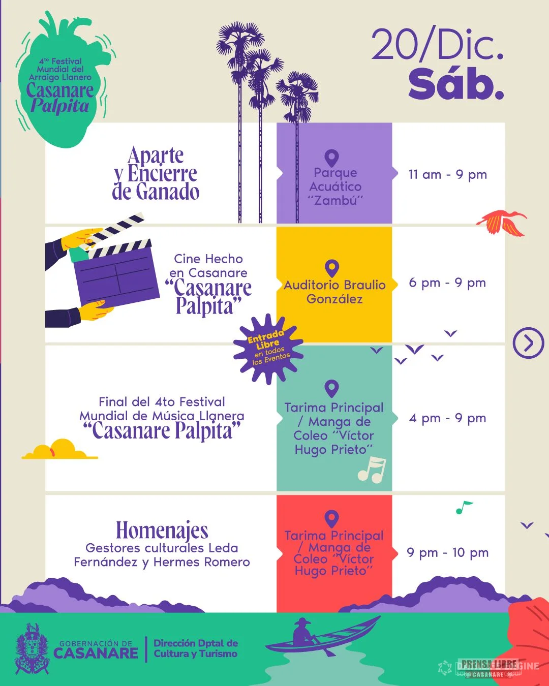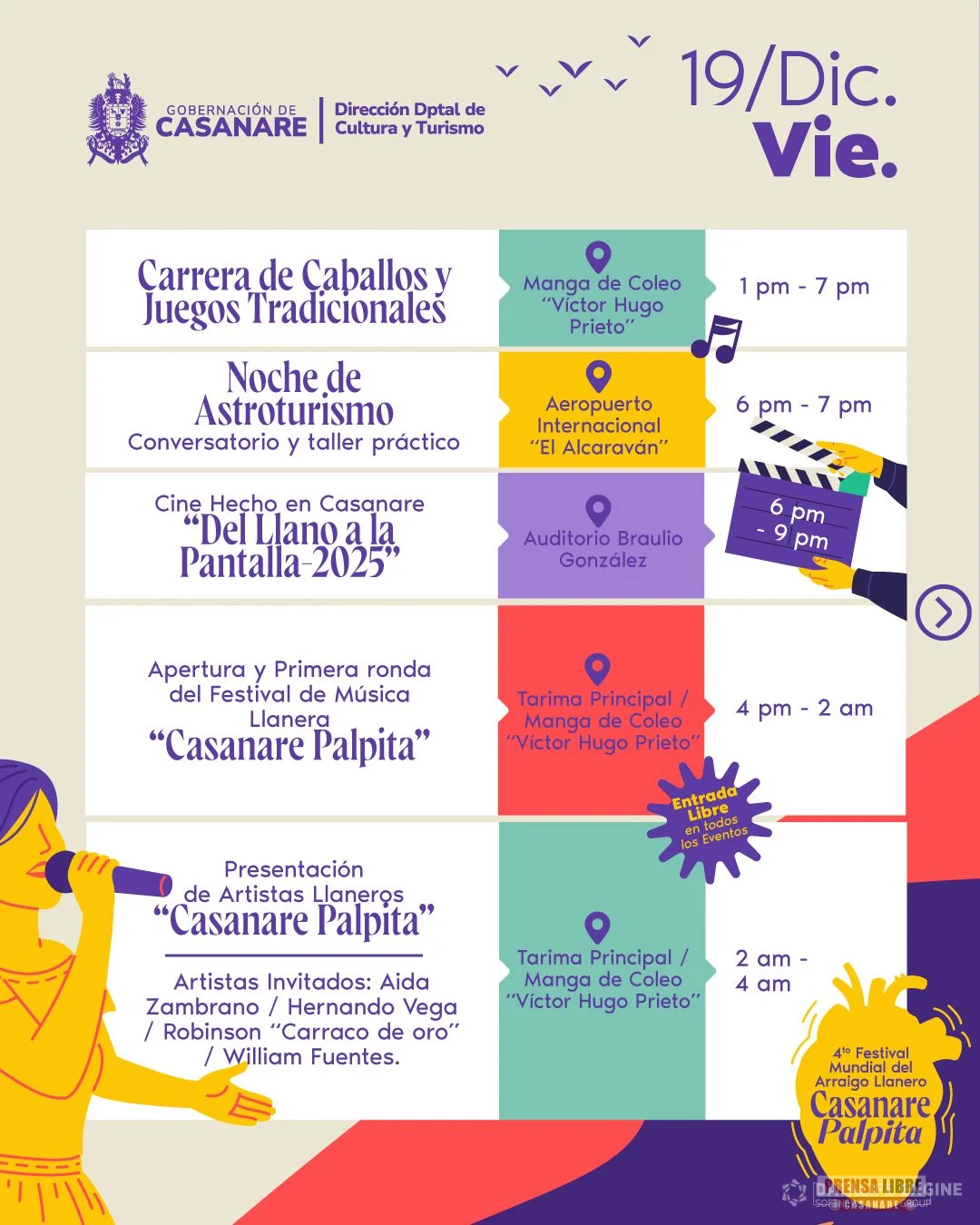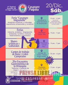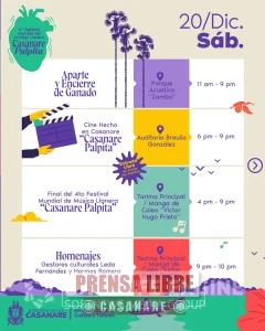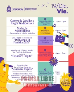 El viernes 19 de diciembre se desarrollarán ferias multisectoriales, el Segundo Encuentro Gastronómico de la Orinoquia, muestras artísticas y culturales, cine hecho en Casanare, actividades de arraigo llanero y la apertura oficial del Festival de Música Llanera “Casanare Palpita”, junto con su primera ronda y presentaciones de artistas llaneros.