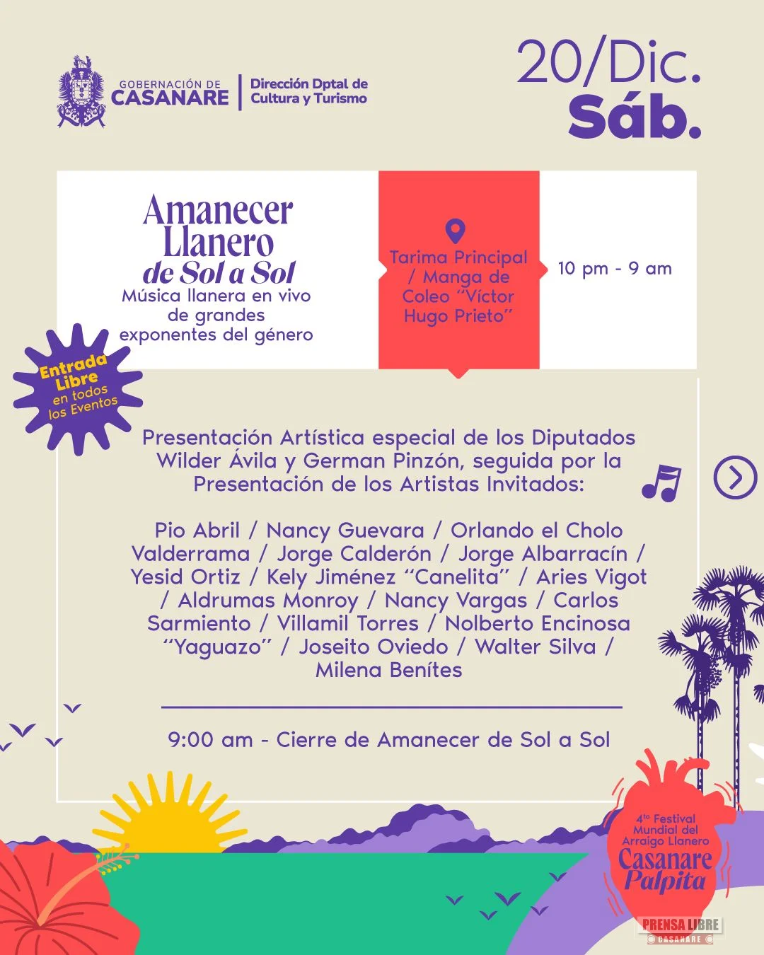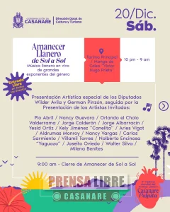 El sábado 20 de diciembre la programación incluirá ferias, cantos de trabajo de llano, coleo campesino, encuentros gastronómicos, actividades ganaderas, la final del Festival Mundial de Música Llanera, homenajes a gestores culturales y el tradicional Amanecer Llanero de Sol a Sol, con presentaciones artísticas continuas durante la noche y la madrugada.