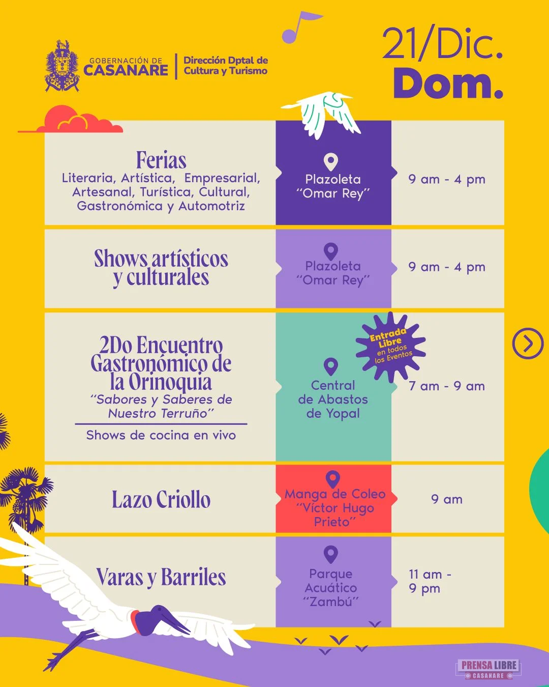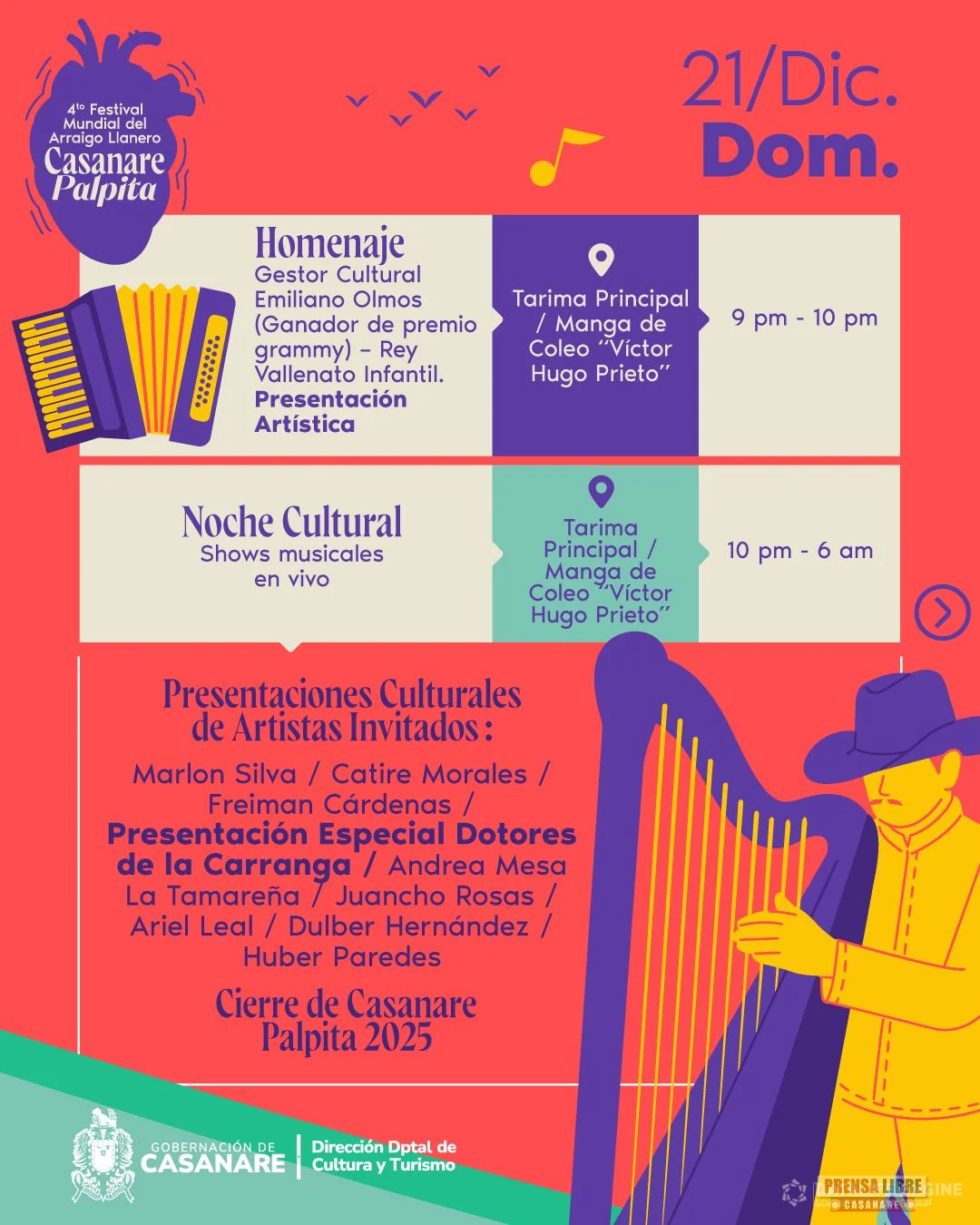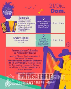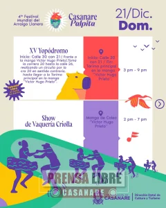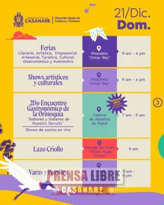 La jornada del domingo 21 de diciembre estará marcada por ferias, shows culturales, encuentros gastronómicos, actividades tradicionales como varas y barriles, el XV Yopódromo, lazo criollo, homenajes culturales y la Noche Cultural, con lo que se dará cierre oficial a Casanare Palpita 2025.