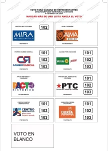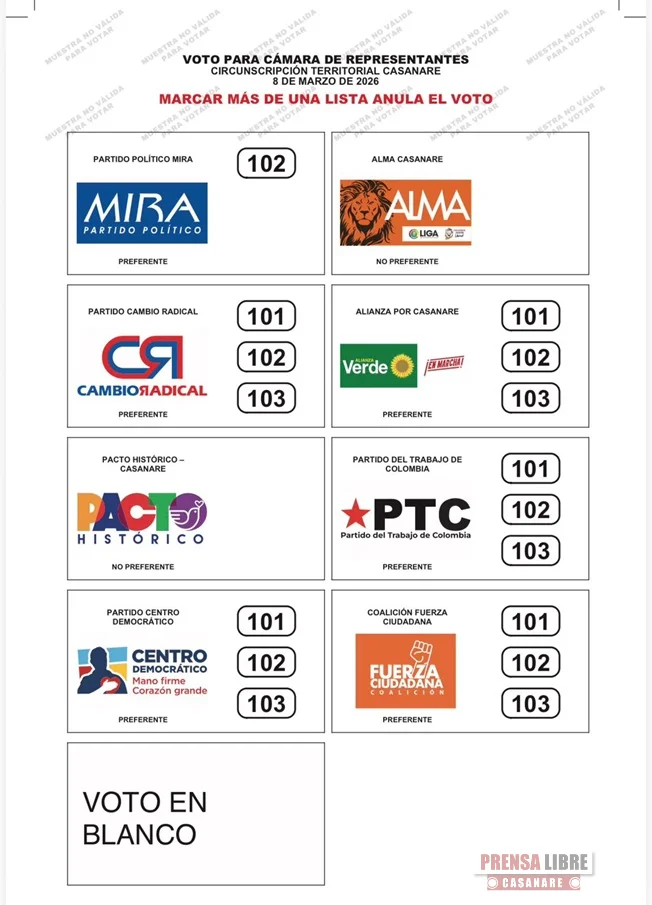 Según informó la Registraduría, el tarjetón para la Cámara de Representantes por Casanare incluye a las diferentes colectividades con sus respectivos logos y números asignados, así como la casilla correspondiente al voto en blanco.