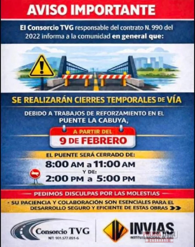 El Consorcio TVG informó que a partir del 9 de febrero de 2026 se realizarán cierres temporales en la vía Yopal – Paz de Ariporo, a la altura del kilómetro 2, sector del puente La Cabuya, debido a trabajos de mantenimiento y reforzamiento del viaducto.