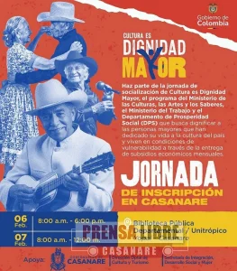 En el marco de la Convocatoria Dignidad Mayor, la Gobernación de Casanare realiza jornadas de inscripción presenciales y virtuales, dirigidas a los adultos mayores del departamento que han dedicado su vida a la cultura, las artes y los saberes tradicionales.