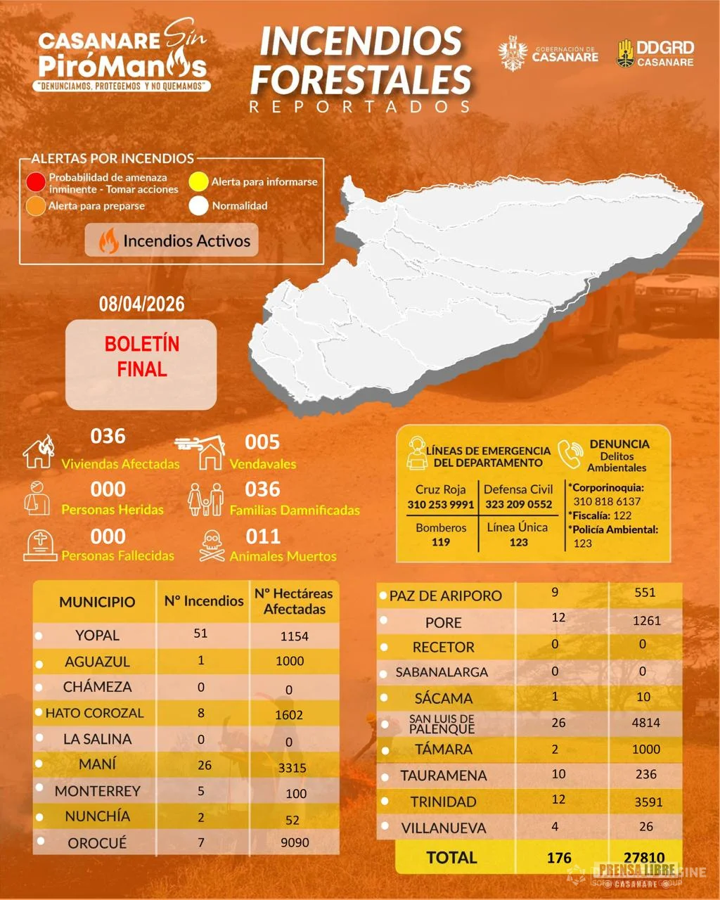 El balance final de la temporada seca en Casanare deja 183 emergencias reportadas en el departamento. De estas, 165 corresponden a incendios de cobertura vegetal que consumieron 27.810 hectáreas y provocaron la muerte de once animales; además de 11 incendios estructurales con pérdidas totales y parciales de viviendas; cinco vendavales que afectaron 36 casas y una institución educativa; un sismo con epicentro en Aguazul y la emergencia registrada en el relleno sanitario de Paz de Ariporo.