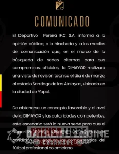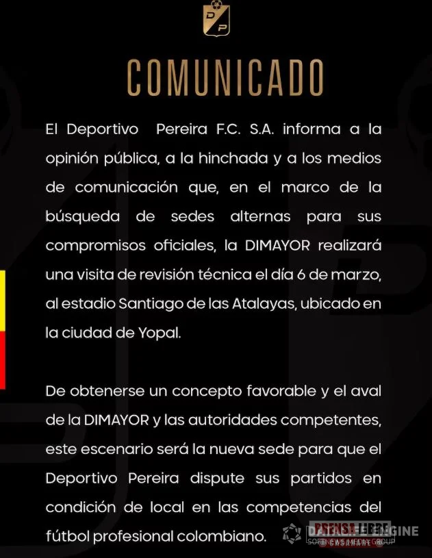 El Deportivo Pereira jugaría como local en Yopal dentro de las competencias del fútbol profesional colombiano, siempre que se obtenga un concepto favorable de la Dimayor y de las autoridades competentes.
