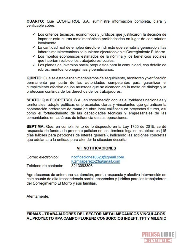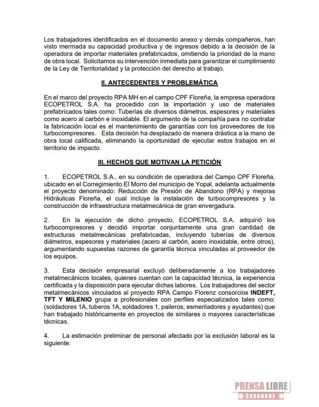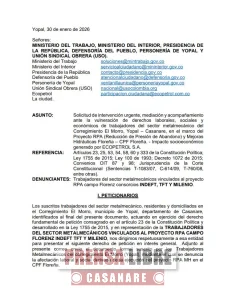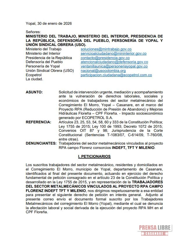 Trabajadores del sector metalmecánicos consorcios Indeft, Tft y Milenio, en una comunicación dirigida a los Ministerios del Trabajo, Interior, Presidencia de la República, Defensoría del Pueblo, Personería de Yopal y la Unión Sindical Obrera, solicitaron intervención urgente, mediación y acompañamiento ante la presunta vulneración de derechos laborales, sociales y económicos de trabajadores del sector en el Corregimiento El Morro de Yopal, en el marco del Proyecto RPA (Reducción de Presión de Abandono) y Mejoras Hidráulicas Floreña – CPF Floreña.