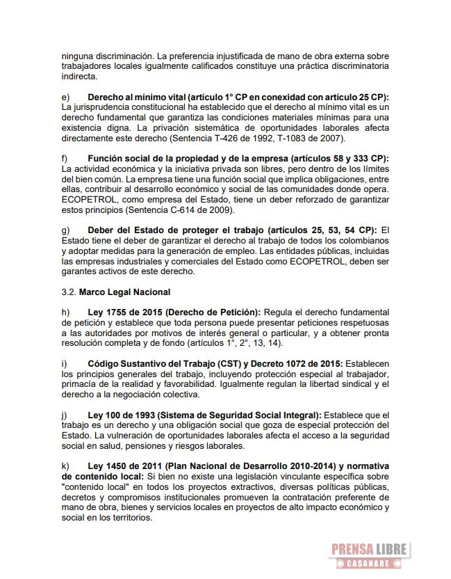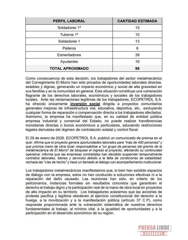 Previnieron sobre el impacto socioeconómico generado por Ecopetrol S.A., denunciando la afectación laboral y social derivada de la ejecución del proyecto RPA MH en el CPF Floreña.