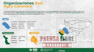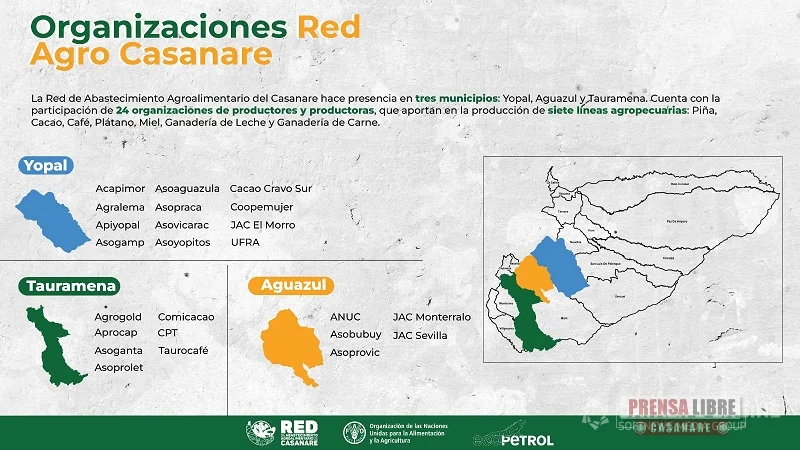 Las 24 formas organizativas están distribuidas así: 12 en Yopal, 7 en Tauramena y 5 en Aguazul que están vinculadas con los procesos productivos de: miel, plátano, cacao, café, piña, ganadería de carne y ganadería de leche.