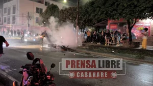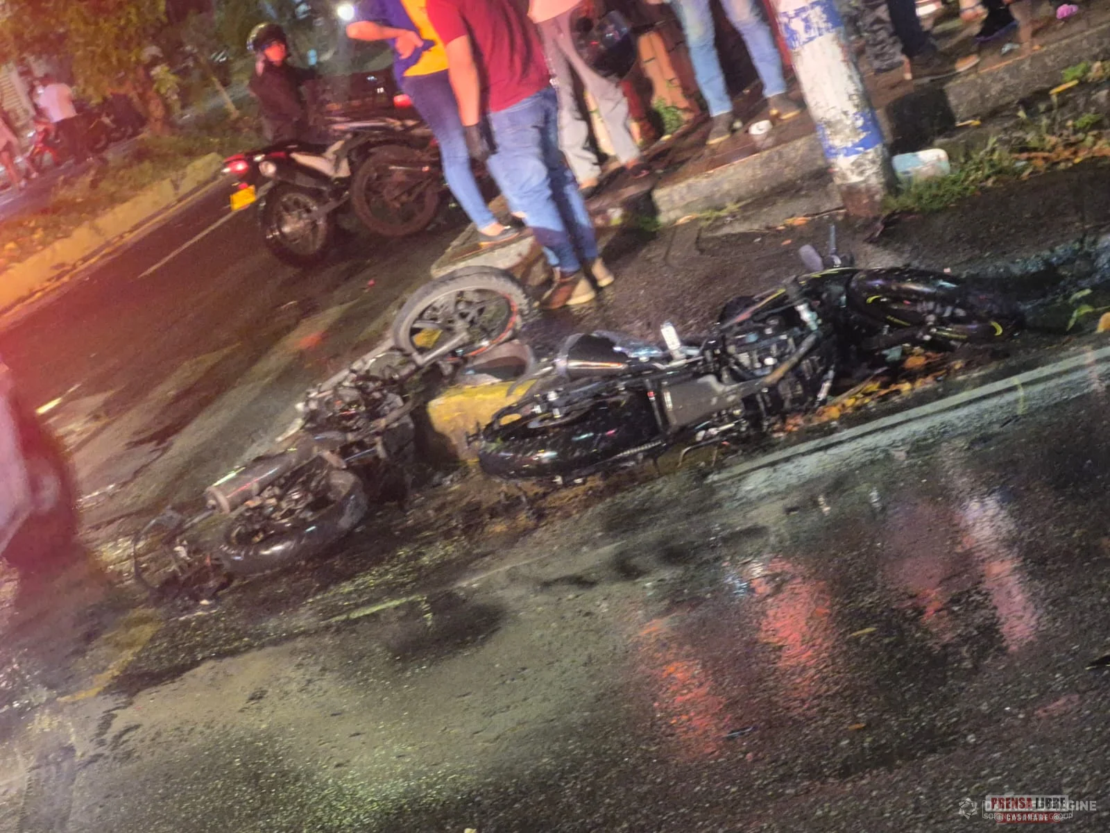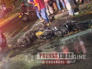 Un aparatoso accidente de tránsito se registró la noche de este jueves 2 de octubre en la intersección de la calle 24 con carrera 21 de Yopal, donde chocaron 2 motocicletas, dejando como saldo a dos personas con lesiones de consideración, identificadas como Zamira Rondón Díaz y Cristian Arturo Camargo, quienes fueron trasladados a centros asistenciales.