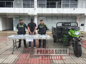 En el barrio El Triunfo de Yopal, la Policía capturó a un sujeto que fue sorprendido transportando una gran cantidad de marihuana en un motocarro. La acción fue posible gracias a la información oportuna de un ciudadano que alertó a las autoridades sobre el sospechoso desplazamiento del vehículo.