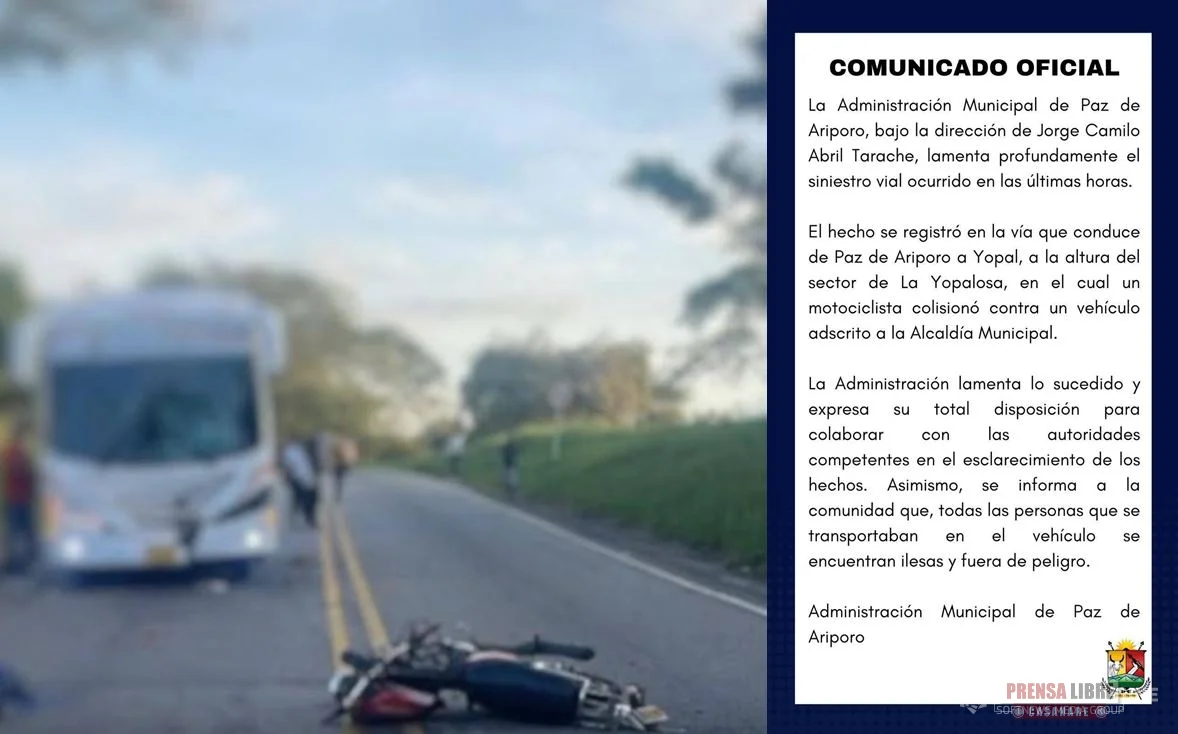 La Administración Municipal de Paz de Ariporo, bajo la dirección de Jorge Camilo Abril Tarache, lamentó el siniestro y expresó su total disposición para colaborar con las autoridades en el esclarecimiento de los hechos. Por su parte, la Policía de Tránsito y Transporte asumió la investigación del caso, señalando como hipótesis inicial la invasión del carril contrario por parte del motociclista.