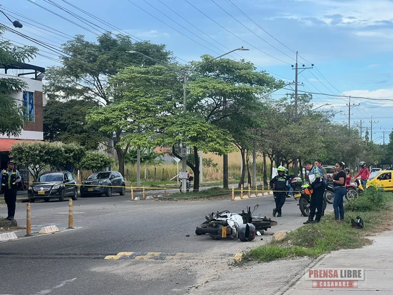 Un adulto mayor y un agente de Tránsito resultaron lesionados tras un siniestro vial ocurrido este lunes en la calle 30 con carrera 36A de Yopal. En el hecho se vieron involucradas la motocicleta del ciudadano de la tercera edad, de placas RRN-90G, y la moto oficial asignada al funcionario, identificada con placas SFT-46D.