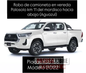 Los delincuentes escaparon en una camioneta blanca modelo 2022, de placas KSU 158, la cual ya fue reportada como robada ante las autoridades competentes. Los sujetos aprovecharon la falta de vigilancia en la zona rural para ejecutar el hurto sin ser detectados.
