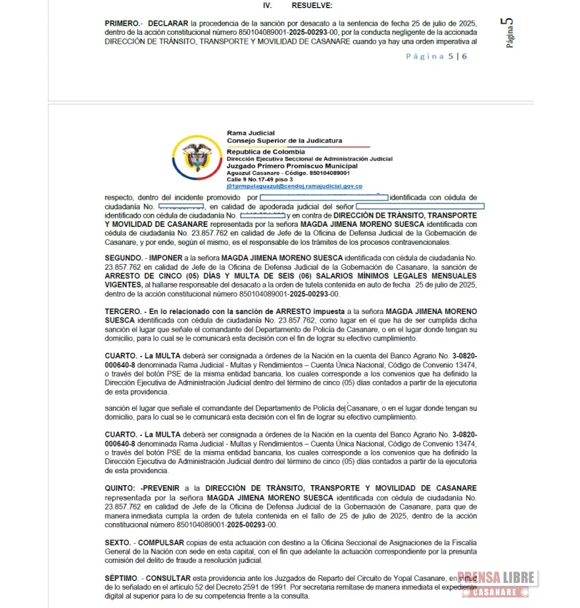 Adicionalmente, el juzgado ordenó prevenir a la Dirección de Tránsito, Transporte y Movilidad de Casanare para que en adelante dé cumplimiento estricto a las órdenes judiciales, con el fin de evitar nuevas sanciones.
