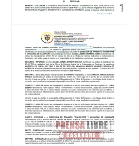 Como consecuencia, el despacho judicial sancionó a la señora Magda Jimena Moreno Suesca, en su calidad de jefe de la Oficina de Defensa Judicial de la Gobernación de Casanare, con cinco (5) días de arresto y una multa equivalente a cinco (5) salarios mínimos legales mensuales vigentes. El arresto deberá cumplirse en las instalaciones del Comando del Departamento de Policía de Casanare o en el lugar que este disponga.