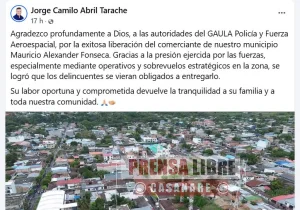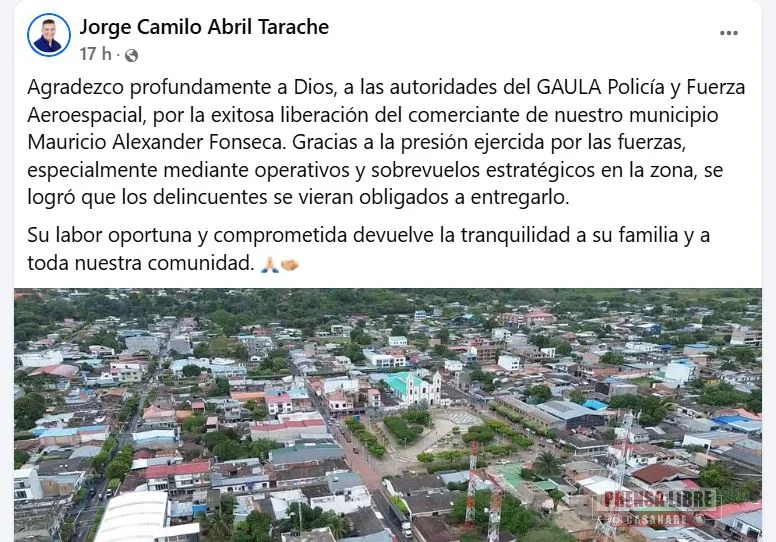 Uno de los primeros en confirmar que Mauricio regresó a la libertad fue el Alcalde de Paz de Ariporo Jorge Camilo Abril Tarache, quien a través de sus redes sociales señaló: “Agradezco profundamente a Dios y a las autoridades del GAULA Policía y Fuerza Aeroespacial, por la exitosa liberación del comerciante de nuestro municipio Mauricio Alexander Fonseca. Gracias a la presión ejercida por las fuerzas, especialmente mediante operativos y sobrevuelos estratégicos en la zona, se logró que los delincuentes se vieran obligados a entregarlo. Su labor oportuna y comprometida devuelve la tranquilidad a su familia y a toda nuestra comunidad”.