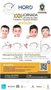 Del 12 al 17 de noviembre se realizará en el Hospital Regional de la Orinoquía la tercera jornada gratuita de cirugías para corregir labio fisurado y paladar hendido, liderada por la Gobernación de Casanare, la Gestora Social Diana Soler y la Fundación Dibujando Alegría.