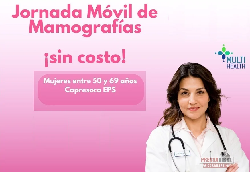 Con el objetivo de facilitar el acceso a servicios de diagnóstico y promover la detección temprana del cáncer de mama, Capresoca EPS, llevará a cabo una Jornada Móvil de Mamografías sin costo para mujeres afiliadas entre los 50 y 69 años de edad, solo con la orden médica y documento de identidad.