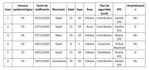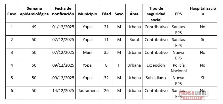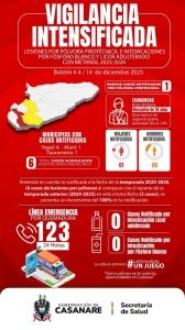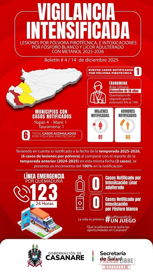 Seis casos confirmados por clínica de lesiones por pólvora pirotécnica, confirmó la Secretaría de Salud de Casanare con corte al 14 de diciembre, en el marco del Período de Vigilancia Intensificada en que se realiza seguimiento permanente a la notificación de eventos por lesiones por pólvora e intoxicaciones por fósforo blanco y licor adulterado con metanol, que va del 01 de diciembre 2024 al 17 de enero de 2026 en el departamento, con el fin de orientar acciones de prevención y atención oportuna en salud.