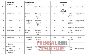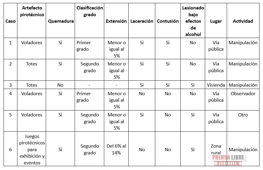 Los casos notificados se han registrado 4 en Yopal, uno en Maní y otro en Tauramena. Las lesiones han sido causadas, 3 con voladores, 2 con totes y uno con juegos pirotécnicos para exhibición y eventos.