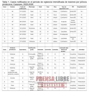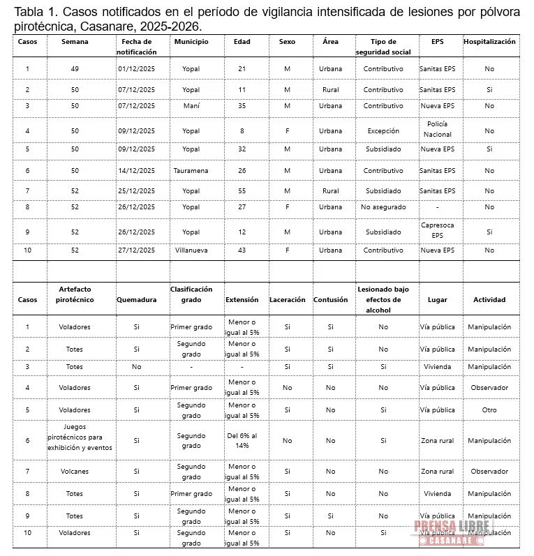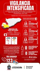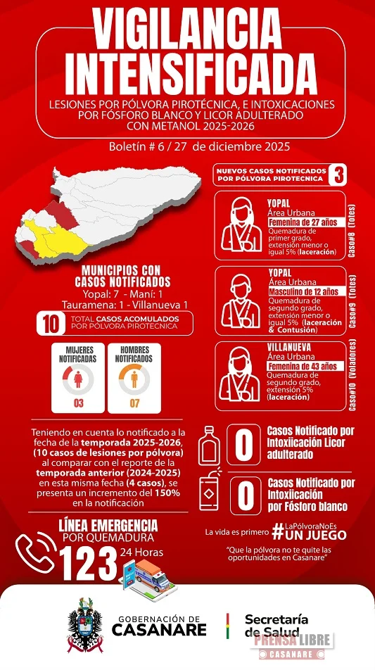 En el balance de lesiones por pólvora pirotécnica e intoxicaciones por fósforo blanco y licor adulterado con metanol con corte al 27 de diciembre de 2025, se han notificado en Casanare un total de 10 casos confirmados, de los cuales tres (3) casos ingresaron en las últimas 24 horas, según la Secretaría de Salud del departamento.