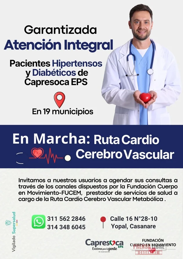 Capresoca EPS, bajo medida de intervención forzosa con fines administrativos ordenada por la Superintendencia Nacional de Salud, informó a su población afiliada con diagnóstico de hipertensión arterial y diabetes que, está garantizada su atención integral en salud con la Fundación Cuerpo en Movimiento-FUCEM, como operador de la Ruta Cardio Cerebro Vascular Metabólica, en los 19 municipios del departamento.