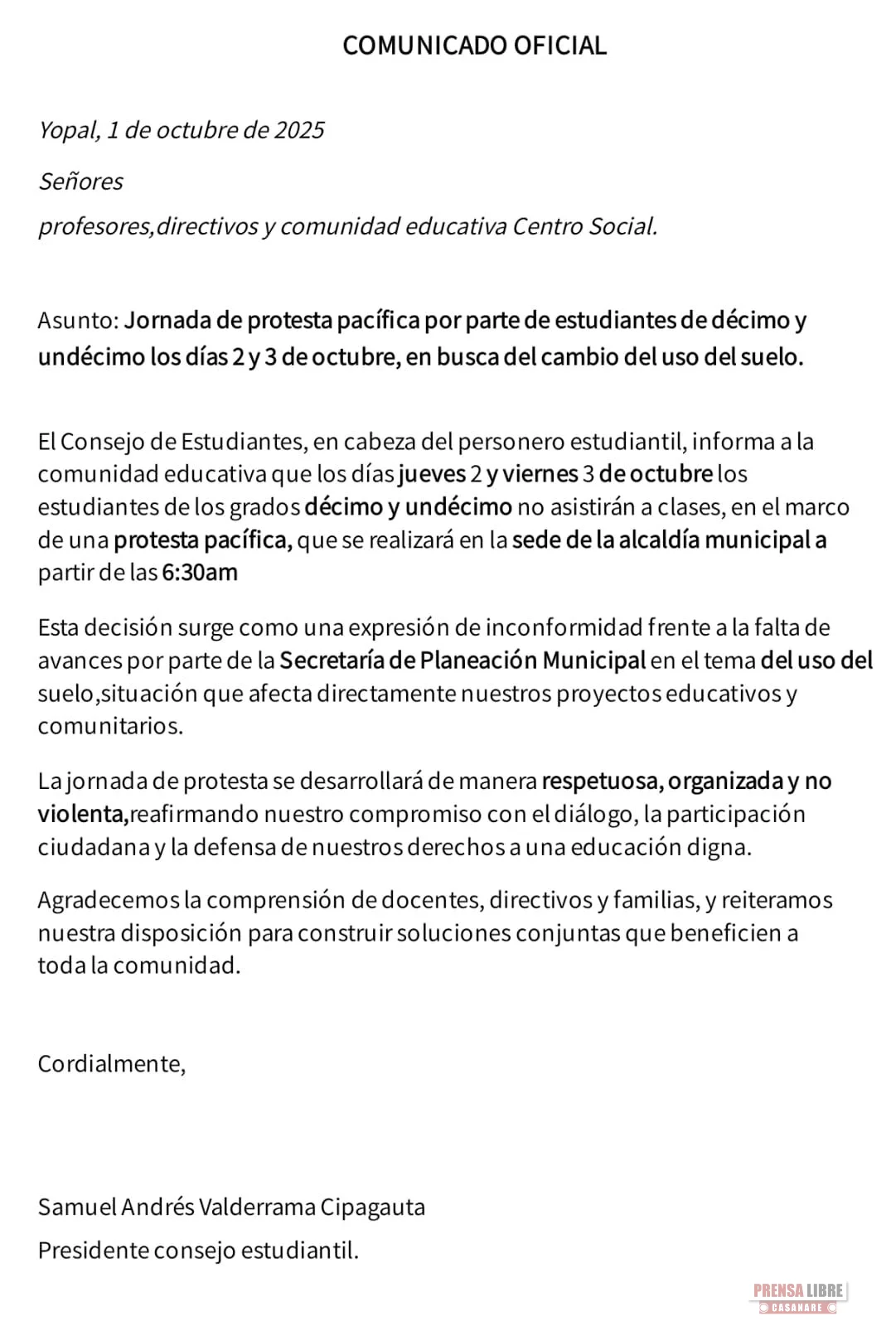 Los alumnos de los grados décimo y undécimo de la Institución Educativa Centro Social realizarán hoy y mañana una jornada de protesta pacífica en la Alcaldía Municipal, manifestando su inconformismo, por los pocos avances de la Secretaría de Planeación de Yopal en la modificación del uso del suelo del predio donde se contempla la construcción de la nueva sede del colegio.