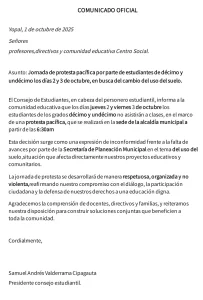Los estudiantes anunciaron en un comunicado que no asistirán a clases durante el 2 y 3 de octubre y en cambio se concentrarán desde las 6:30 de la mañana en la sede de la Administración Municipal, para expresar su preocupación por la falta de avance y compromiso con los derechos de los jóvenes a una educación digna, según justificaron.
