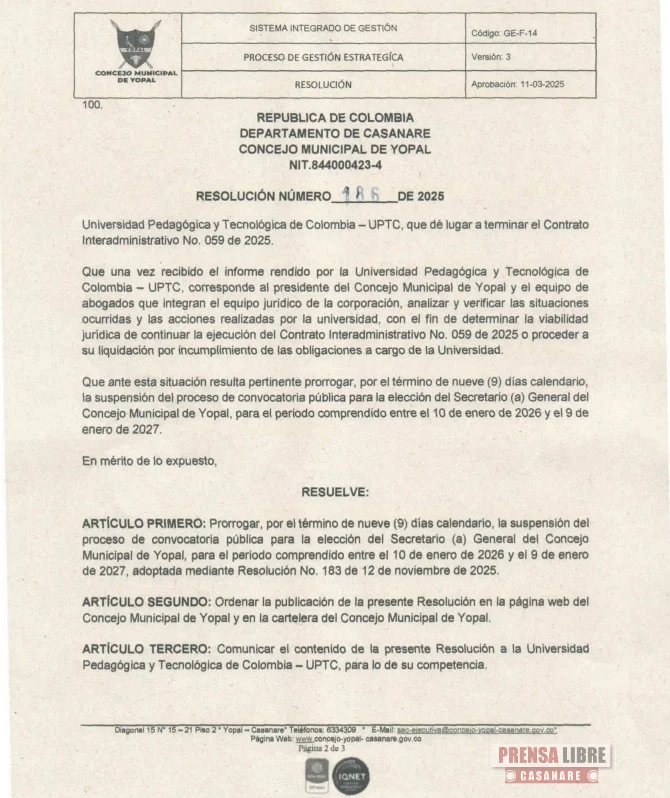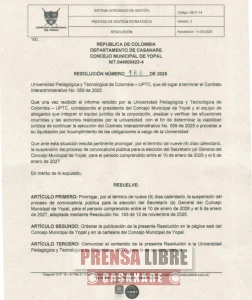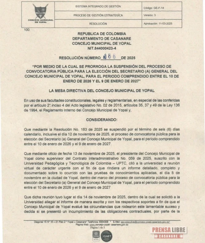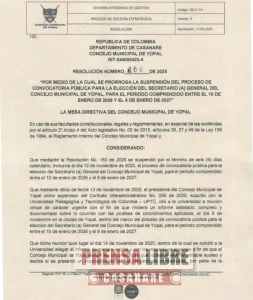 El Concejo Municipal de Yopal prorrogó por nueve días la suspensión del proceso de convocatoria pública para elegir al Secretario General para el periodo 2026-2027. La medida fue adoptada mediante la Resolución 186 de 2025, luego de que la corporación solicitara a la Universidad Pedagógica y Tecnológica de Colombia (UPTC) un informe detallado sobre las irregularidades presentadas durante la prueba de conocimientos aplicada el pasado 8 de noviembre.