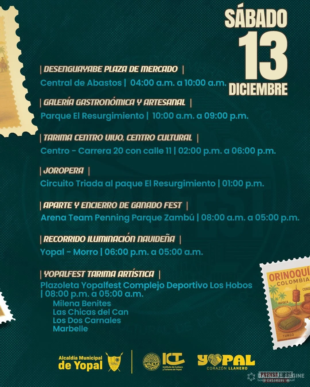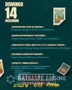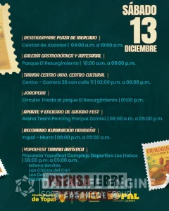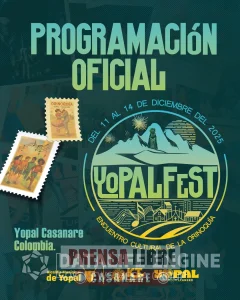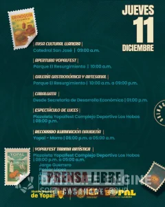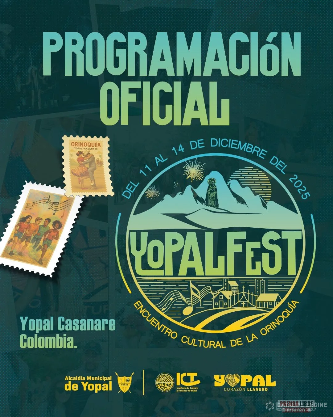 La Alcaldía Municipal de Yopal dio a conocer la programación de las Fiestas de Yopal 2025 – YopalFest, un encuentro cultural que reunirá durante cuatro días actividades religiosas, artísticas, deportivas, gastronómicas y conciertos con artistas de talla nacional e internacional. La agenda, que se desarrollará del 11 al 14 de diciembre, tendrá como epicentro la Plazoleta Yopalfest en el Complejo Deportivo Los Hobos, además de otros escenarios urbanos y rurales del municipio.