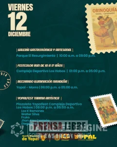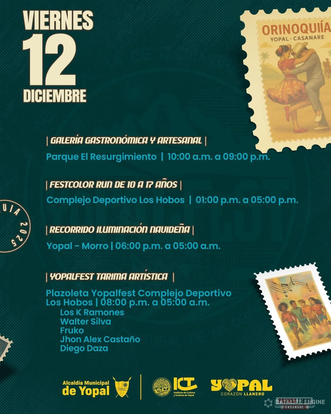 El viernes 12 la agenda continúa con actividades familiares como la galería artesanal y el Festcolor Run para jóvenes. En la noche, la tarima artística recibirá a Los K-Rramones, Walter Silva, Fruko, Jhon Alex Castaño y Diego Daza, quienes animarán la segunda noche de concierto en el Complejo Deportivo Los Hobos. Ese día seguirá habilitado el recorrido de iluminación navideña entre Yopal y el corregimiento de Morro.