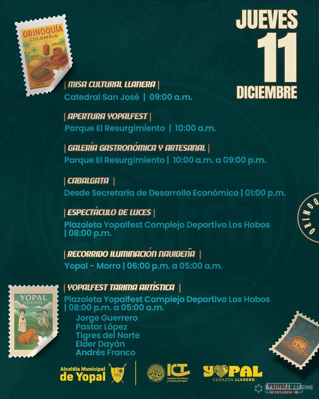 El jueves 11 de diciembre inicia la celebración con una misa cultural llanera en la Catedral San José, seguida de la apertura oficial en el Parque El Resurgimiento y la instalación de la galería gastronómica y artesanal. La jornada incluirá cabalgata, espectáculo de luces y el recorrido de iluminación navideña. La primera noche musical estará a cargo de Jorge Guerrero, Pastor López Jr., Los Tigres del Norte, Elder Dayán y Andrés Franco, quienes se presentarán desde las 8:00 p. m. hasta las 5:00 a. m.