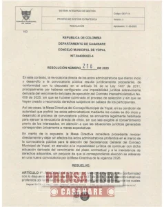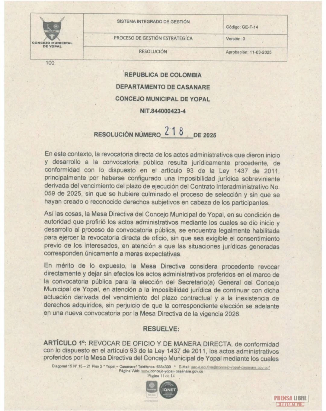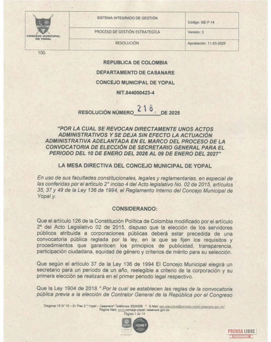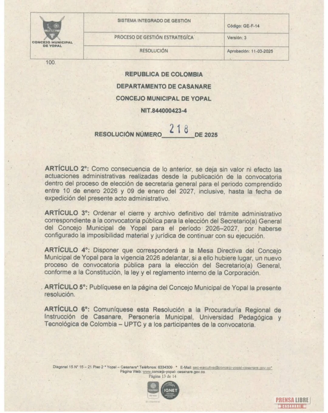 El Concejo Municipal de Yopal informó que fue revocada en su totalidad la convocatoria pública para proveer el cargo de Secretario(a) General para la vigencia 2026–2027, tras la terminación del Contrato Interadministrativo No. 059 de 2025 suscrito con la Universidad Pedagógica y Tecnológica de Colombia (UPTC).