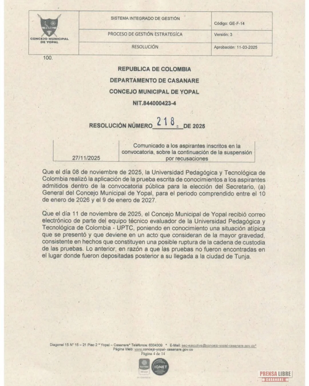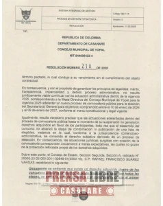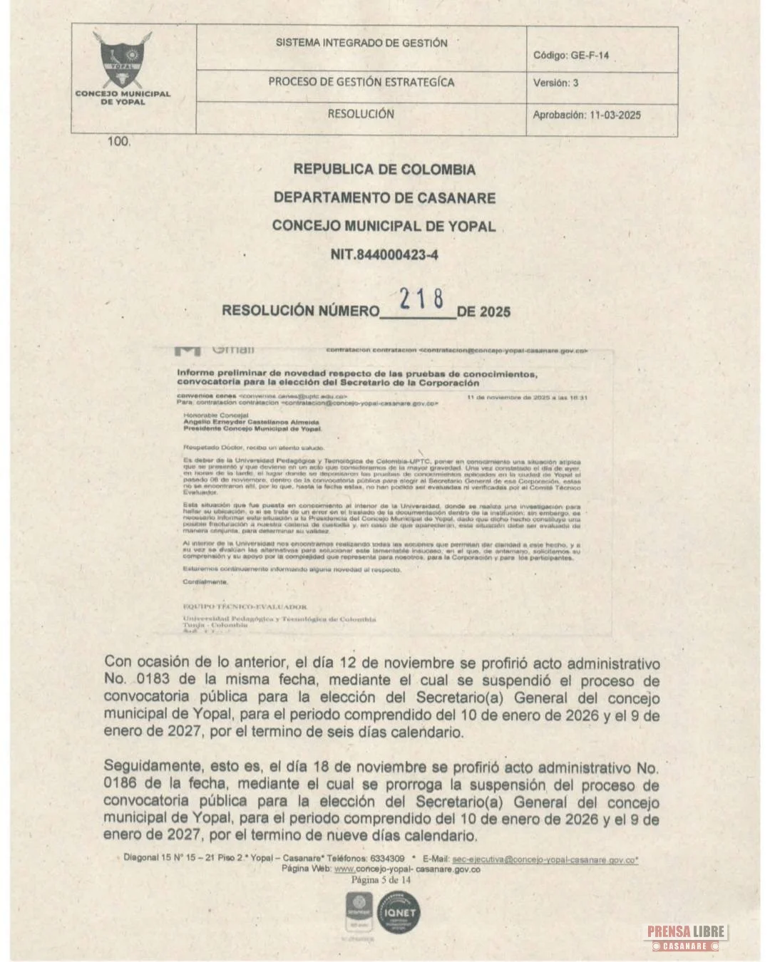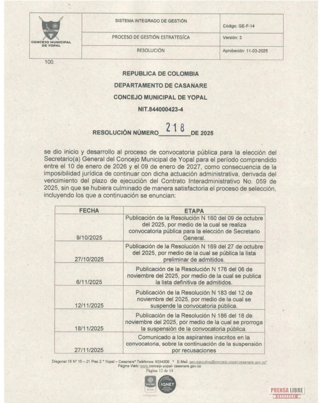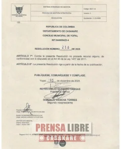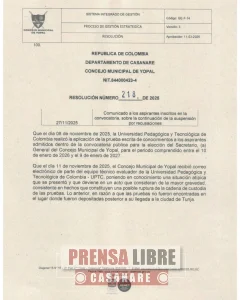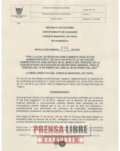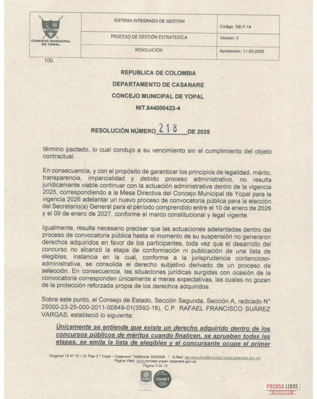 El Concejo Municipal de Yopal informó que fue revocada en su totalidad la convocatoria pública para proveer el cargo de Secretario(a) General para la vigencia 2026–2027, tras la terminación del Contrato Interadministrativo No. 059 de 2025 suscrito con la Universidad Pedagógica y Tecnológica de Colombia (UPTC).
