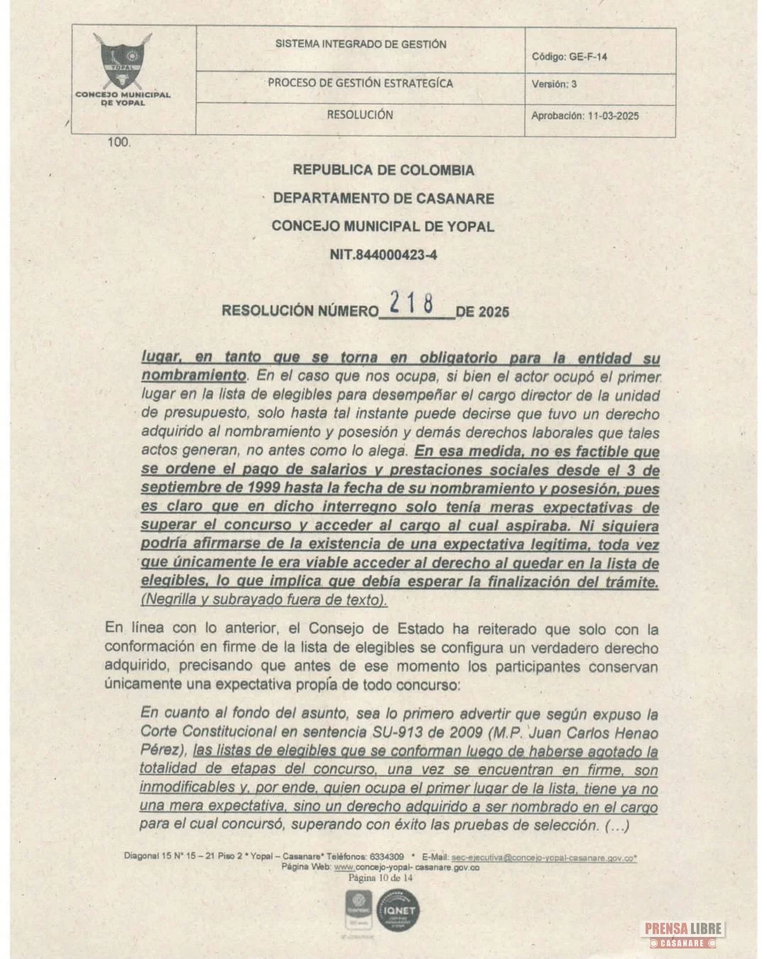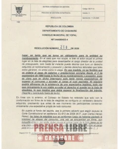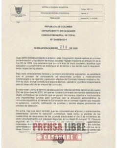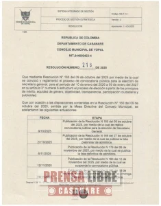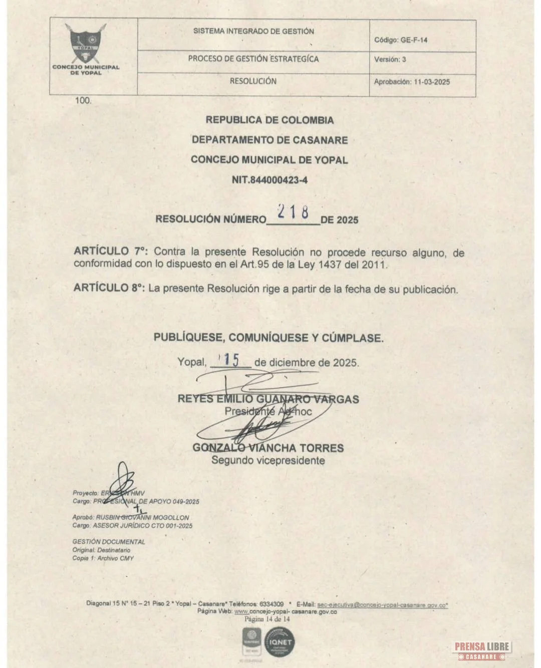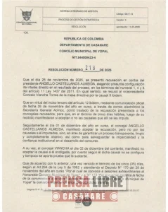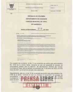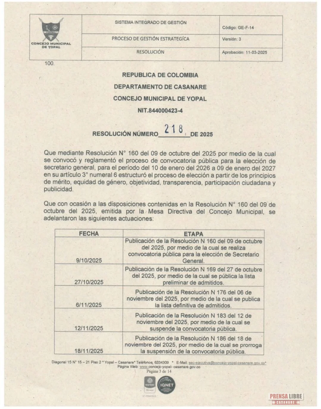 El Concejo Municipal de Yopal informó que fue revocada en su totalidad la convocatoria pública para proveer el cargo de Secretario(a) General para la vigencia 2026–2027, tras la terminación del Contrato Interadministrativo No. 059 de 2025 suscrito con la Universidad Pedagógica y Tecnológica de Colombia (UPTC).