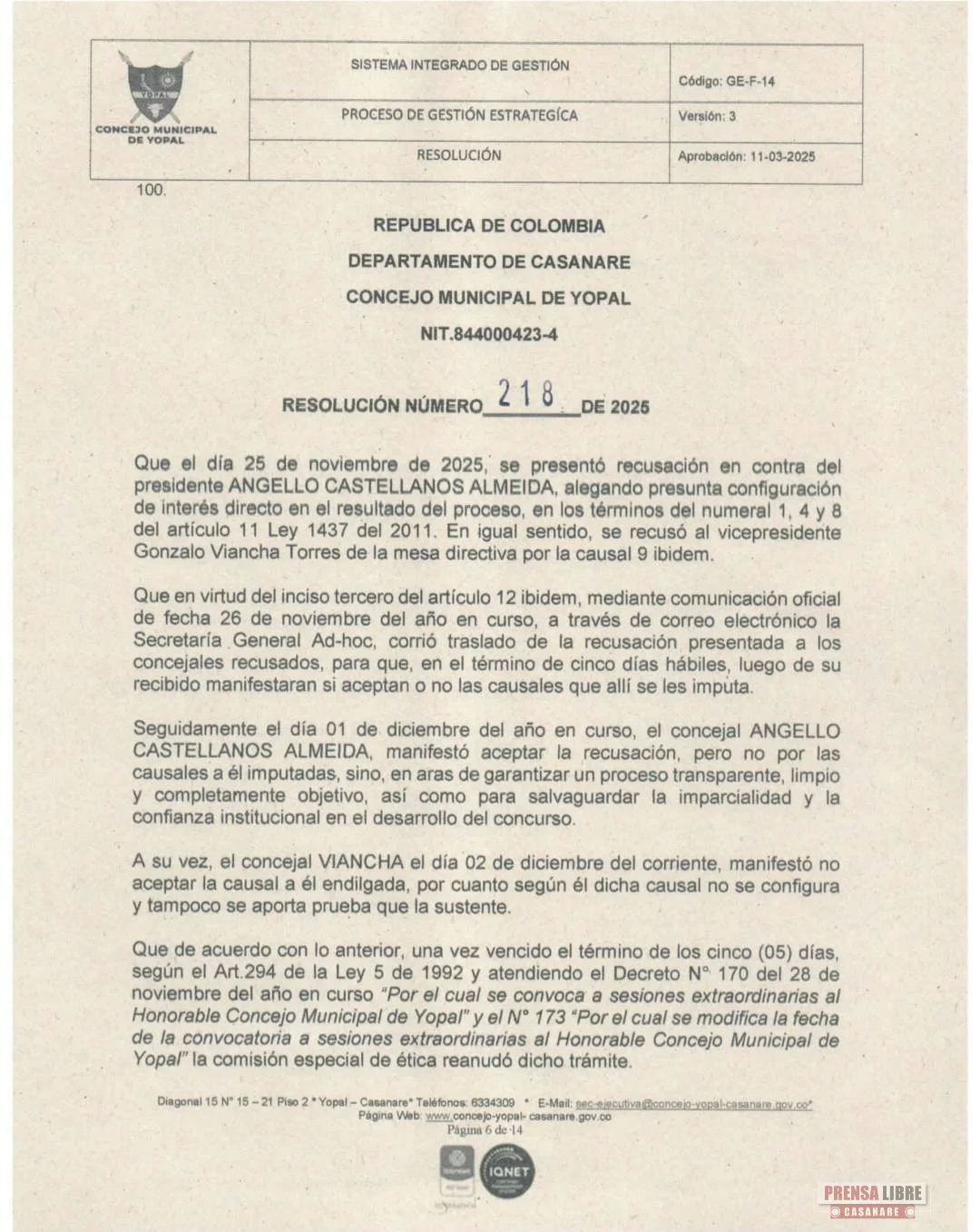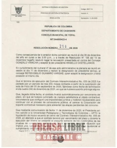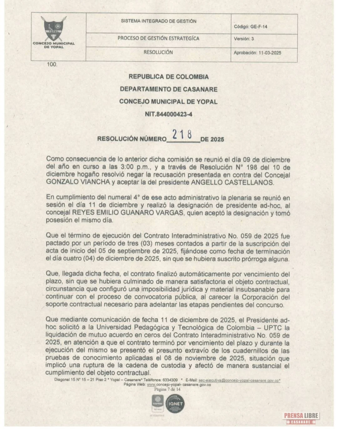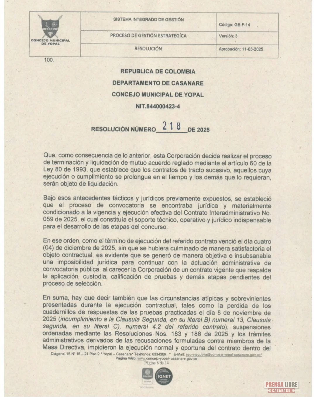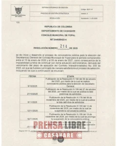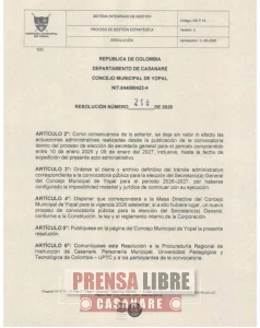 La decisión quedó oficializada mediante la Resolución 218 de 2025, expedida por la Mesa Directiva, en la cual se deja sin efectos todo el proceso adelantado. Según el documento, el contrato con la UPTC venció el pasado 4 de diciembre de 2025 sin que se lograra culminar satisfactoriamente el objeto contractual, lo que generó una imposibilidad jurídica y material para continuar con la convocatoria.