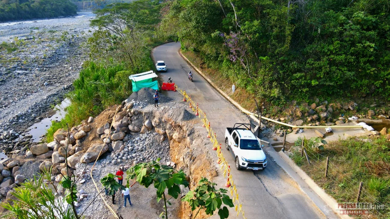 De manera complementaria, se adelantan obras de protección en gaviones, estructuras conformadas por mallas metálicas rellenas con piedra, diseñadas para estabilizar el talud y controlar la erosión. Estas obras buscan frenar la socavación progresiva que año tras año afectaba la calzada y ponía en peligro la pérdida total de la carretera.