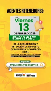 Se acerca el cierre del plazo para cumplir con una de las principales obligaciones tributarias del calendario fiscal en Yopal. Los agentes retenedores deberán realizar hasta el 13 de febrero la presentación y el pago del Impuesto de Industria y Comercio (ICA) correspondiente al bimestre noviembre y diciembre.
