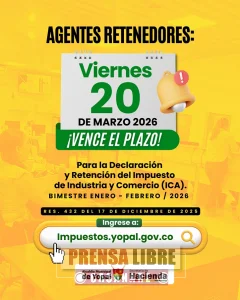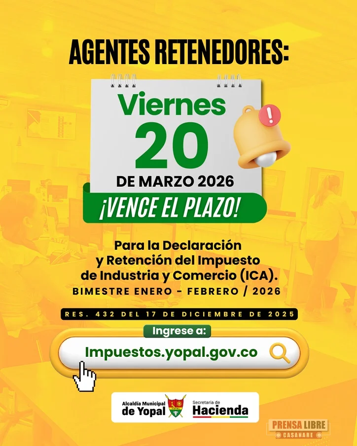 Los agentes retenedores del Impuesto de Industria y Comercio (ICA) en Yopal tienen plazo hasta el 20 de marzo para presentar y pagar la declaración correspondiente al bimestre enero - febrero de 2026, de acuerdo con el calendario tributario del municipio.